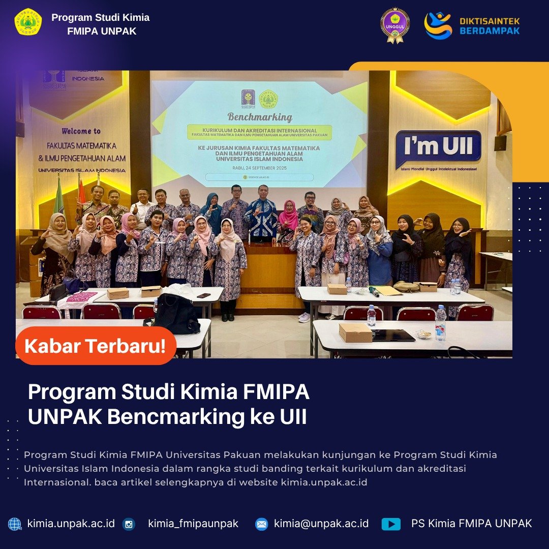 Dosen Program Studi Kimia FMIPA Universitas Pakuan (Unpak) melakukan kegiatan benchmarking ke Universitas Islam Indonesia (UII), sebagai bagian dari upaya untuk meningkatkan mutu dan kualitas pendidikan. Kegiatan ini difokuskan pada studi banding terkait persiapan akreditasi internasional dan pengembangan sistem pendidikan yang lebih baik di kedua institusi.