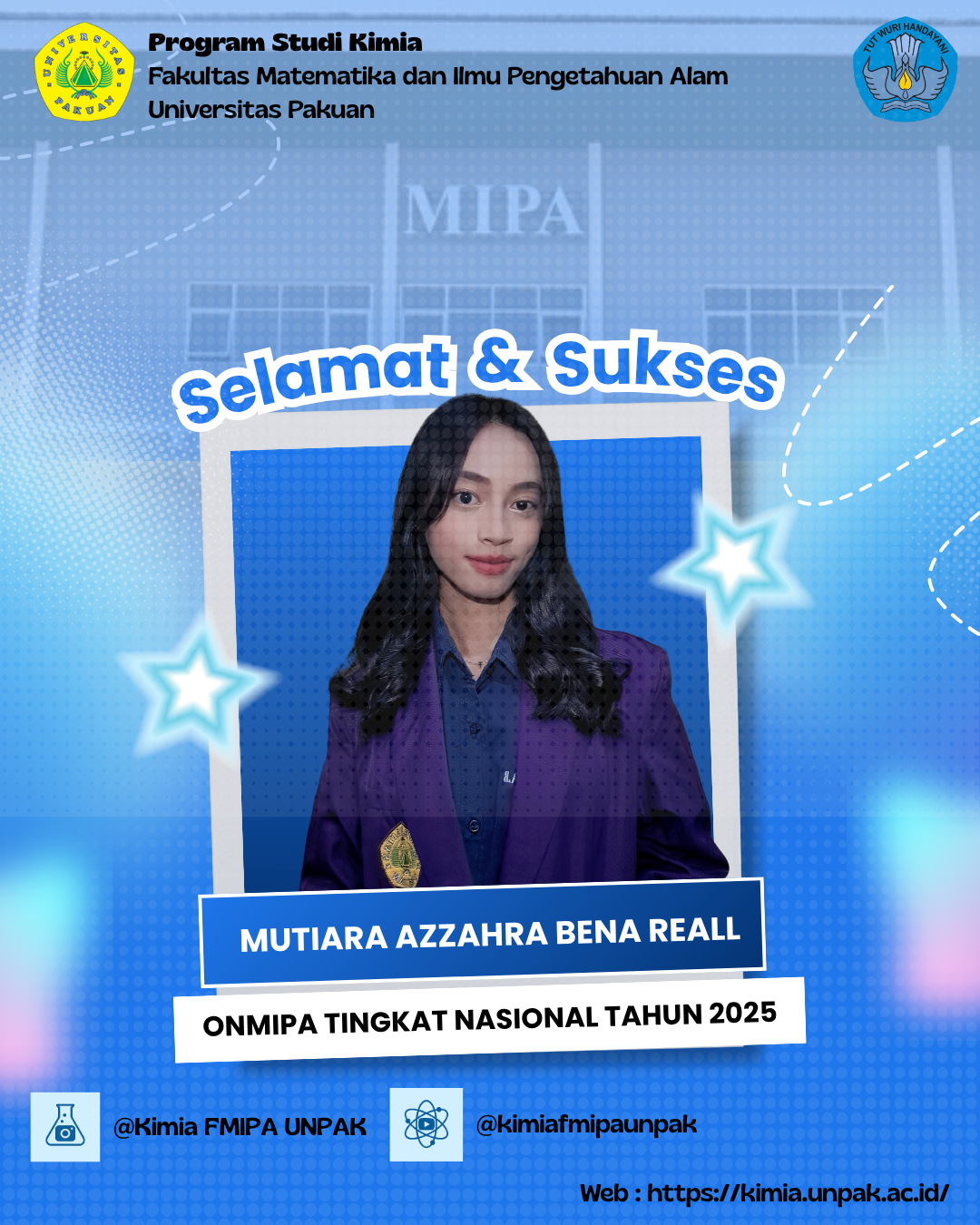 Selamat dan sukses kepada Mutiara Azzahra Bena Reall, mahasiswi Program Studi Kimia Universitas Pakuan (UNPAK) yang kini sedang menempuh semester 5, atas keberhasilannya lolos seleksi wilayah Olimpiade Nasional MIPA (ONMIPA) bidang Kimia. Prestasi gemilang ini menjadikannya salah satu peserta yang akan melanjutkan perjuangannya di tingkat nasional, yang akan diselenggarakan pada tanggal 16 hingga 20 November 2025.